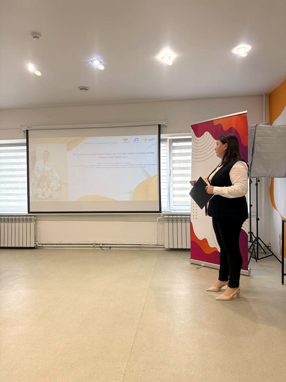 В тематической встрече «Отряды Юнармии и военно- патриотические клубы» свой опыт работы представила Юлия Валерьевна Бежелукова, советник директора по воспитанию МБОУСОШ с. Знаменское. Юлия Валерьевна презентовала воспитательную практику "Квест Победы".