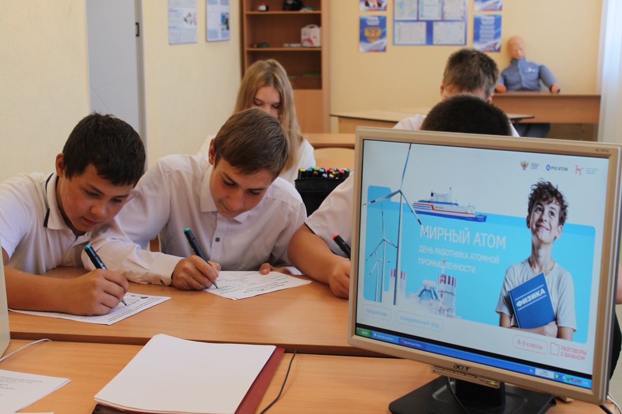 Вместе с обучающимися советник директора по воспитанию Юлия Бежелукова и классные руководители обсудили, какое значение атомная энергия имеет в жизни современного общества и почему труд специалистов этой сферы важен для страны.
